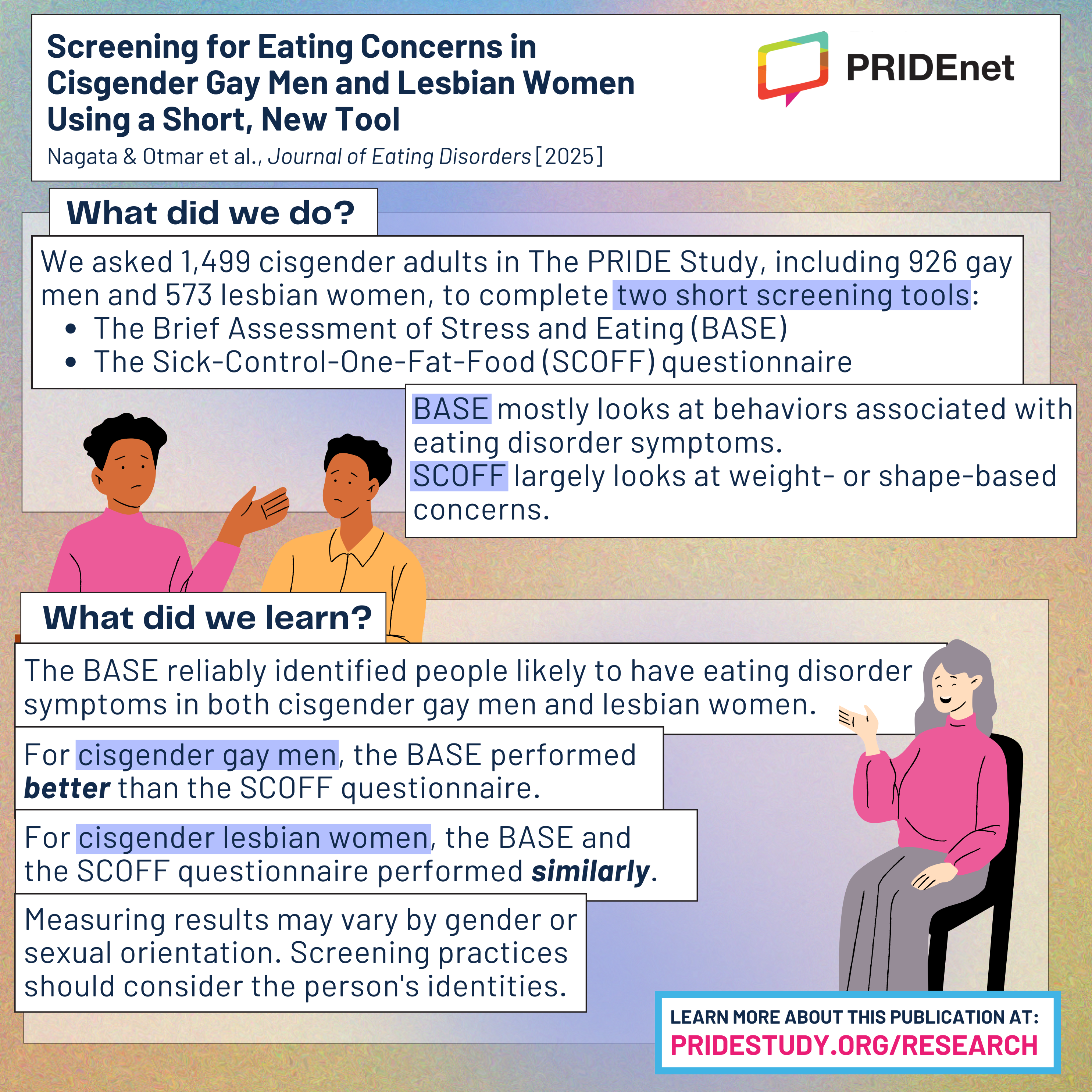 We asked 2,063 cisgender lesbian, gay, and bisexual+ (LGB+) participants in The PRIDE Study to fill out a widely used survey about eating disorder symptoms. Participants included 925 gay men, 573 lesbian women, 116 bisexual+ men, and 448 bisexual+ women.